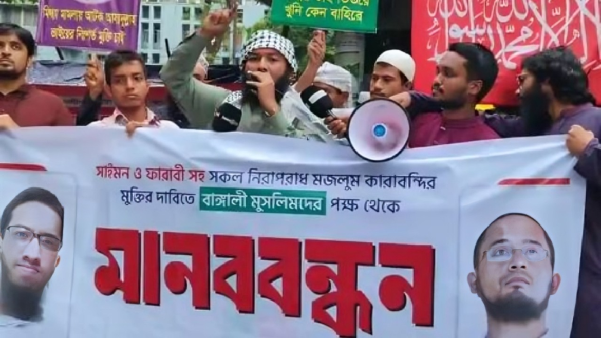 রাজধানীর জাতীয় প্রেসক্লাবের সামনে বাঙালী মুসলিম যুব সংঘ-এর আয়োজনে এক মানববন্ধন অনুষ্ঠিত হয়েছে। মানববন্ধনে বক্তারা অবিলম্বে কারাবন্দি মেধাবী ও ইসলামপন্থী মূল্যবোধে বিশ্বাসী যুবকদের মুক্তির দাবি জানান। বিশেষভাবে ফারাবি শফি, সাইমন, আসাদুল্লাহসহ অন্যান্য বন্দিদের মুক্তি দিতে সরকারের প্রতি আহ্বান জানানো হয়।