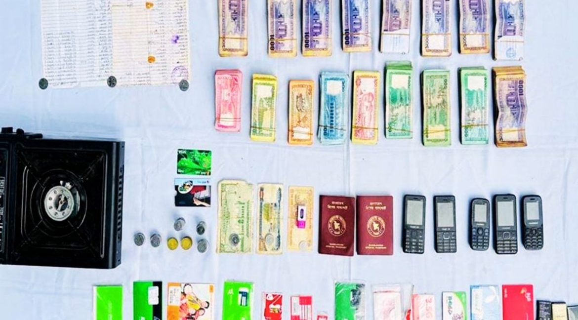 পরবর্তী তল্লাশিতে সন্ত্রাসীদের গোপন আস্তানায় ৫টি মোবাইল, উল্লেখযোগ্য সংখ্যক সিম কার্ড, চাঁদা আদায়ের নথিপত্র, নগদ ৯ লাখ ২৯ হাজার ৫১০ টাকা, অন্যান্য সামগ্রী এবং ২টি পুরাতন বিশেষ পাসপোর্ট উদ্ধার করা হয়।