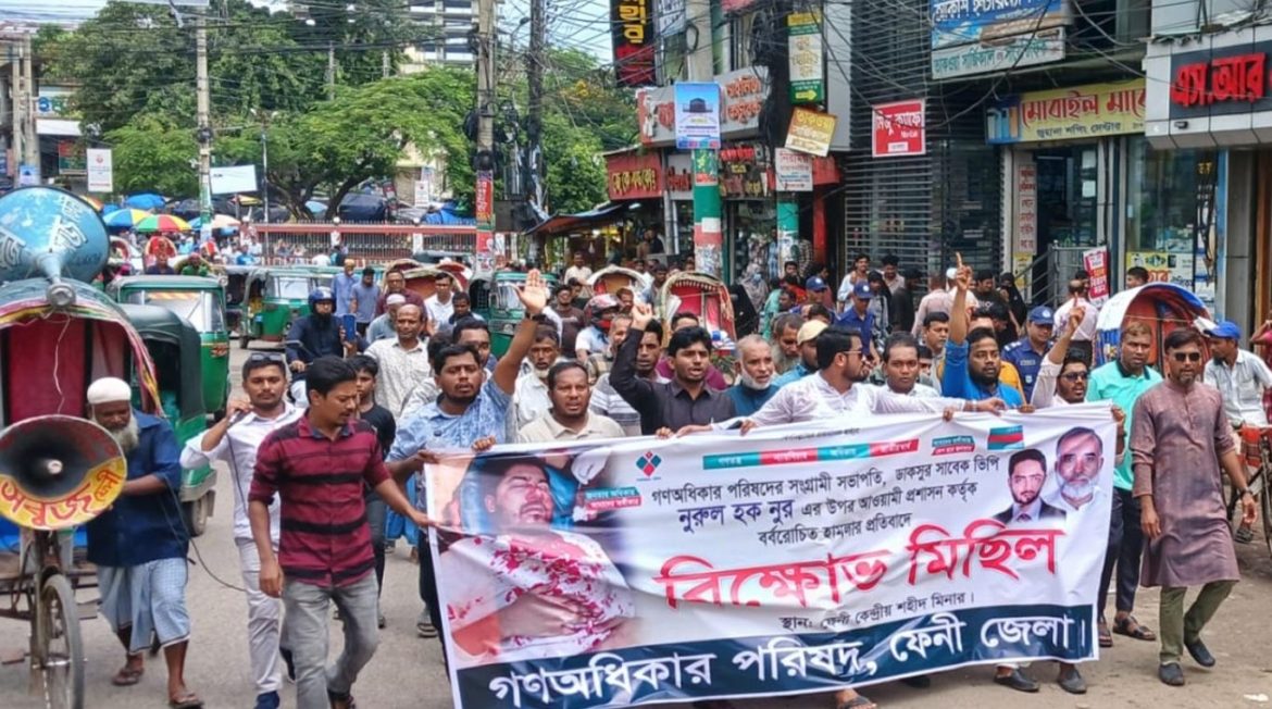 ডাকসুর সাবেক ভিপি, গণঅধিকার পরিষদের সভাপতি নুরুল হক নুরের উপর হামলার প্রতিবাদে ফেনী শহরে বিক্ষোভ মিছিল করেছে গণঅধিকার পরিষদ।