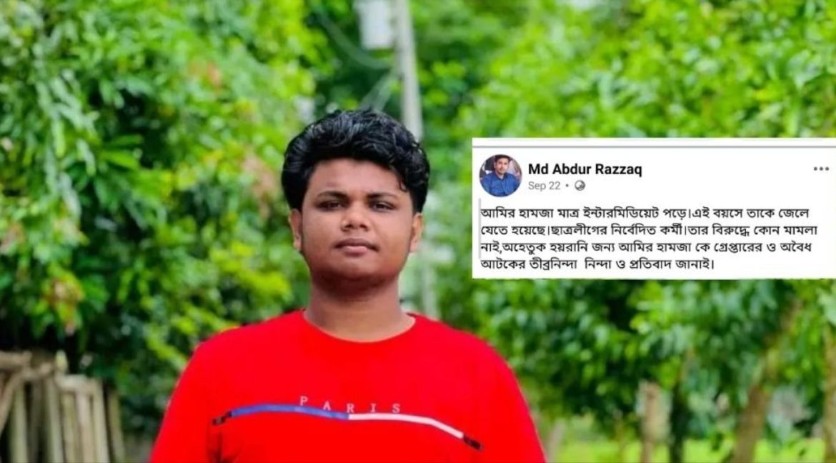 এ সময় জামায়াত নেতা ইয়াছিন আরাফাত আমির হামজা রাসেলকে গ্রেফতারের নিন্দা জানান এবং রাসেলকে কলেজ ছাত্রশিবিরের সভাপতিও দাবি করেন। তিনি বলেন, আমির হামজা রাসেলকে একটি দলের ইন্ধনে গ্রেফতার করা হয়েছে। গ্রেফতারের পর কুমিল্লা ডিবির ওসি ও পুলিশ সুপারের সঙ্গে তিনি যোগাযোগ করেছেন।