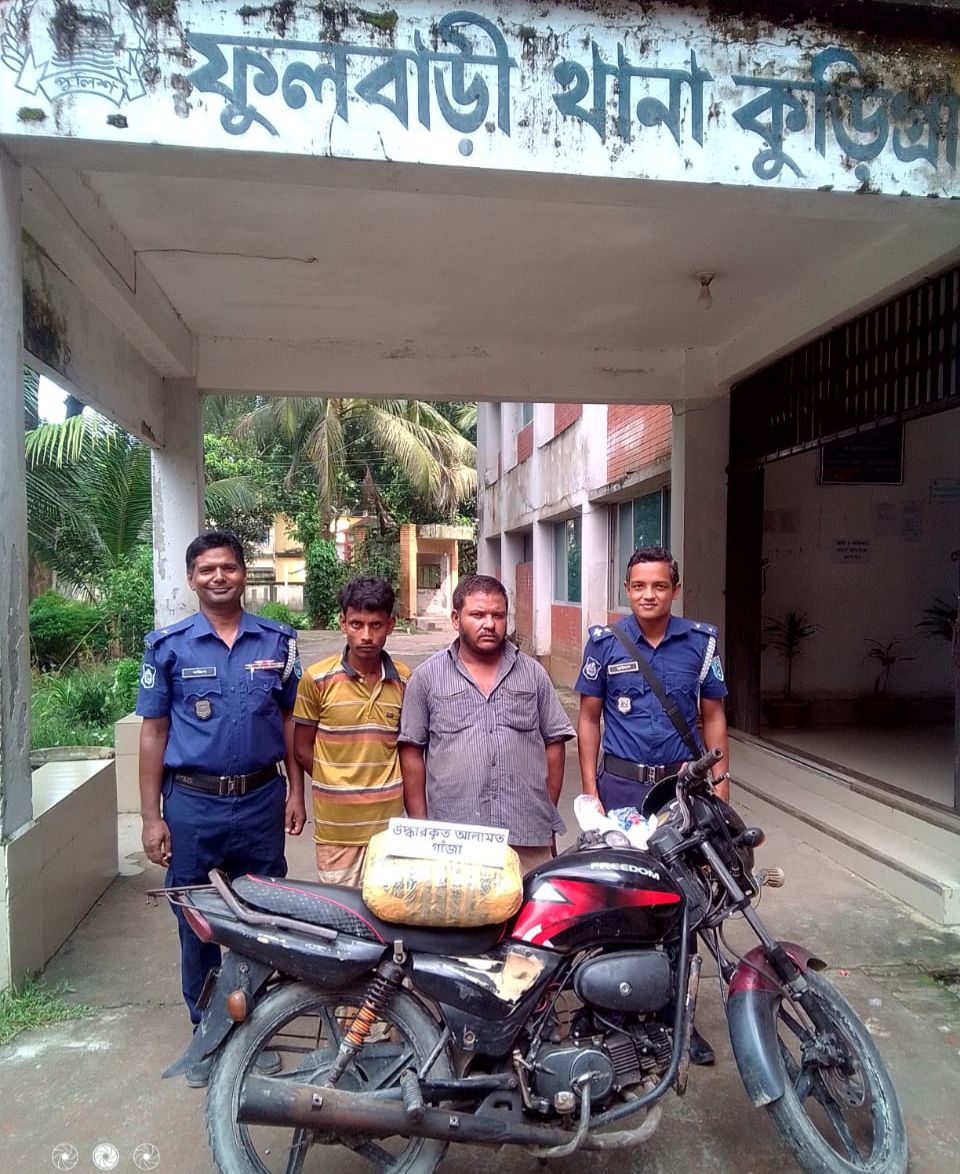 কুড়িগ্রাম জেলার ফুলবাড়ী থানাধীন মধ্য কাশিপুর এলাকায় মাদক বিরোধী অভিযান পরিচালনা করে ৫ কেজি ১০০ গ্রাম গাঁজা ও মাদক পরিবহনে ব্যবহৃত ১ টি মোটরসাইকেল জব্দসহ ২ জন মাদক কারবারিকে গ্রেফতার করেছে ফুলবাড়ী থানা পুলিশের একটি চৌকস টিম। গ্রেফতারকৃত মাদক কারবারিরা হলেন- কুড়িগ্রামের ফুলবাড়ী থানাধীন মধ্য কাশিপুর এলাকার মোঃ এনামুল হক ওরফে এনা (২৮) ও ফুলবাড়ী থানাধীন নওদাবাশ এলাকার মোঃ জিয়াউর রহমান ওরফে জিয়া (৪৫)।