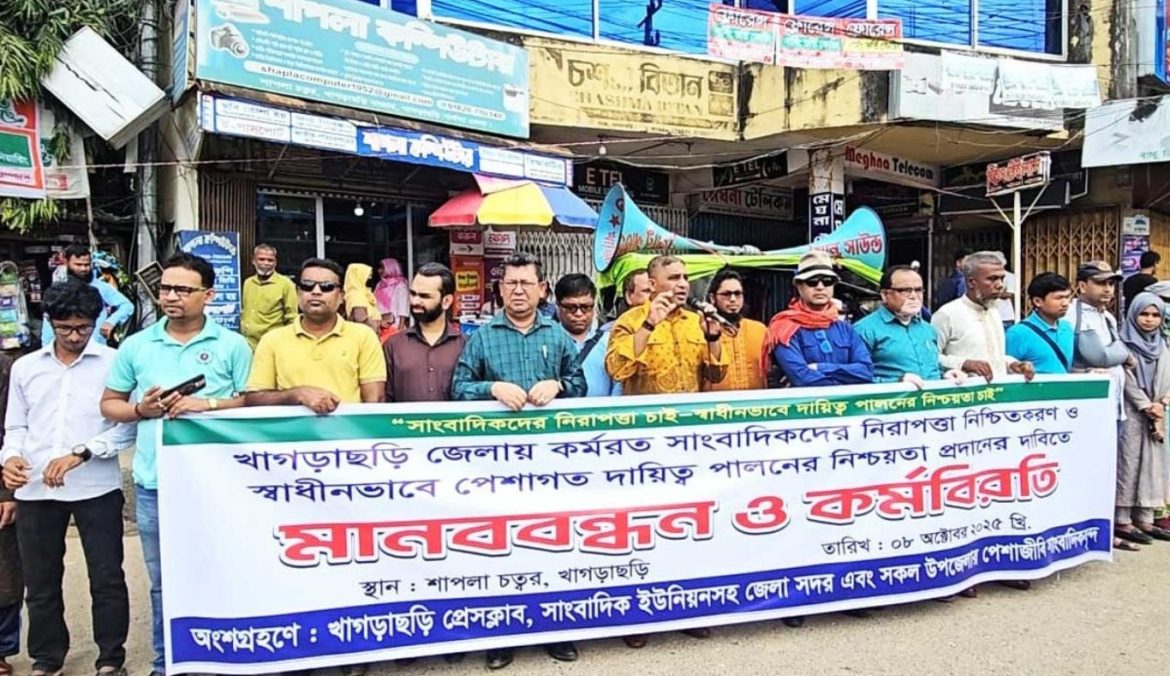 ‘সাংবাদিকদের নিরাপত্তা চাই–স্বাধীনভাবে দায়িত্ব পালনের নিশ্চয়তা চাই’- এই স্লোগানে খাগড়াছড়িতে কর্মরত সাংবাদিকরা মানববন্ধন ও কর্মবিরতি কর্মসূচি পালন করেছেন। পেশাগত নিরাপত্তা ও স্বাধীনভাবে দায়িত্ব পালনের নিশ্চয়তা দাবি করে বুধবার (৮ অক্টোবর) সকালে খাগড়াছড়ি শহরের শাপলা চত্বরে এই কর্মসূচি অনুষ্ঠিত হয়।
