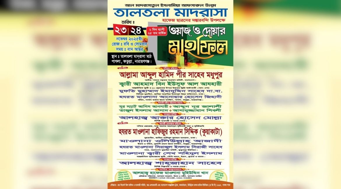 নারায়ণগঞ্জের ফতুল্লার তালতলায় অবস্থিত ঐতিহ্যবাহী ও সুপ্রসিদ্ধ ধর্মীয় শিক্ষা প্রতিষ্ঠান ‘আল মাদরাসাতুল ইসলামিয়া আফসারুল উলূম তালতলা মাদরাসায়’ আগামী ২৩ ও ২৪ নভেম্বর ২০২৫, রবি ও সোমবার ২দিন ব্যাপী ২৫ তম বার্ষিক ওয়াজ ও দোয়া মাহফিল অনুষ্ঠিত হবে।