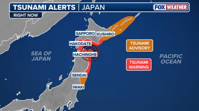 জেএমএ জানায়, স্থানীয় সময় রাত ১১টা ১৫ মিনিটে ভূমিকম্পটি অনুভূত হয়। সংস্থাটি সতর্ক করে জানায়, উত্তর-পূর্ব উপকূলে সর্বোচ্চ তিন মিটার (প্রায় ১০ ফুট) উচ্চতার সুনামি আছড়ে পড়তে পারে। সতর্কতা জারি করা হয়েছে হোক্কাইডো, আওমোরি ও ইওয়াতে—এই তিন প্রদেশে।