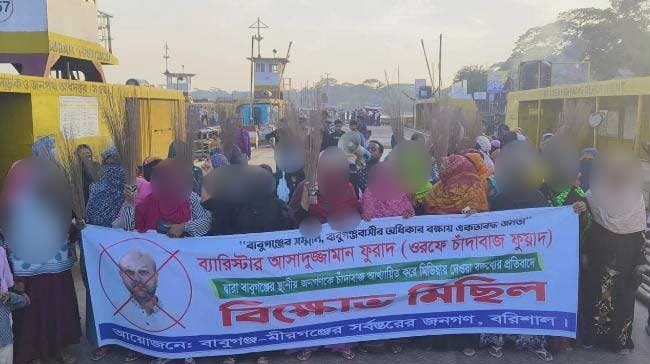 বুধবার বিকেল বাবুগঞ্জ উপজেলার মীরগঞ্জ বাজারে স্থানীয়দের উদ্যোগে এ কর্মসূচি পালন করা হয়। বিক্ষোভে অংশ নেওয়া শতাধিক নারী-পুরুষ ব্যারিস্টার ফুয়াদের বক্তব্যের তীব্র নিন্দা জানিয়ে অবিলম্বে বক্তব্য প্রত্যাহার ও তার বিরুদ্ধে আইনগত ব্যবস্থা গ্রহণের দাবি জানান।