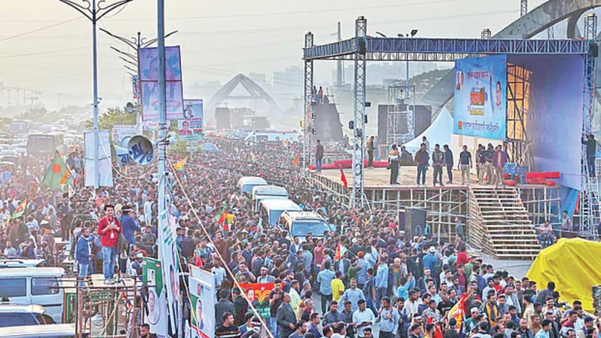 ভোরের আলো ফোটার আগেই রাজধানীর পূর্বাচলের ৩০০ ফিট সড়কে জমায়েত হতে শুরু করেছেন বিএনপির বিপুলসংখ্যক নেতাকর্মী। ব্যানার, ফেস্টুন ও দলীয় পতাকায় রঙিন হয়ে উঠেছে পুরো এলাকা। কনকনে শীত উপেক্ষা করে বৃহস্পতিবার (২৫ ডিসেম্বর) রাত থেকেই অনেকেই পূর্বাচলে অবস্থান করছেন। কেউ এসেছেন দেশের বিভিন্ন জেলা থেকে, আবার কেউ ঢাকার বাসিন্দা।
