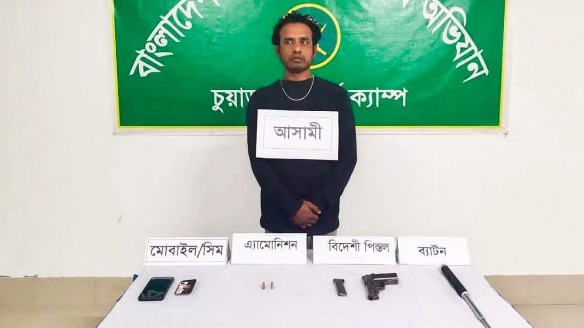 উদ্ধার করা মালপত্রের মধ্যে রয়েছে একটি বিদেশি পিস্তল, দুটি গুলি, একটি স্মার্টফোন, ১১টি সিমকার্ড এবং একটি ব্যাটন।