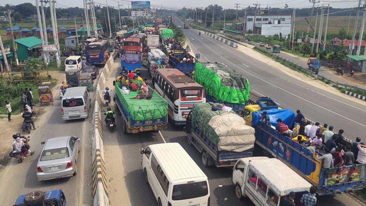 ঘণ্টার পর ঘণ্টা যানজটে আটকে পড়েছেন যাত্রীরা। অনেকেই গণপরিবহন না পেয়ে খোলা ট্রাক ও পিকআপ ভ্যানে ঝুঁকি নিয়ে যাত্রা করছেন।