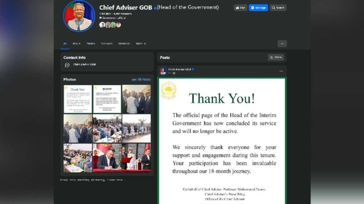 বিবৃতিতে বলা হয়, ‘ধন্যবাদ! অন্তর্বর্তী সরকারের প্রধান উপদেষ্টার অফিশিয়াল পেজটি আর সক্রিয় থাকবে না। গত ১৮ মাস সময়কালজুড়ে সকলের সহায়তা, আগ্রহ ও অংশগ্রহণের জন্য আমরা আন্তরিক ধন্যবাদ জানাই। আপনাদের সমর্থন, সহযোগিতা, সমালোচনা আমাদের যাত্রাকে আরও মূল্যবান ও সমৃদ্ধ করেছে।’