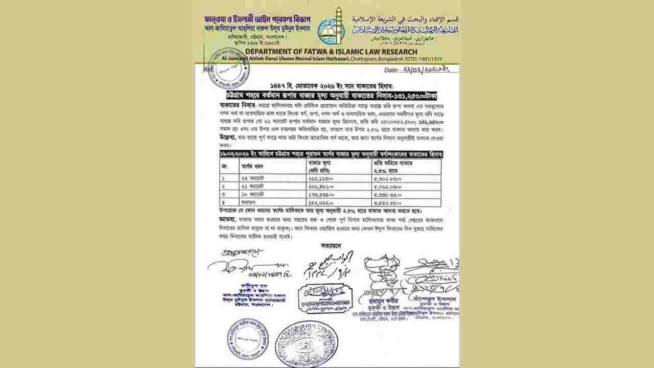 দারুল ইফতার প্রধান মুফতী মনসূরুল হক স্বাক্ষরিত বিজ্ঞপ্তিতে বলা হয়, রূপার দরে স্থানীয়ভাবে তারতম্য হতে পারে; তাই প্রত্যেকে নিজ এলাকায় বাজারদর যাচাই করে যাকাত পরিশোধ করবেন।