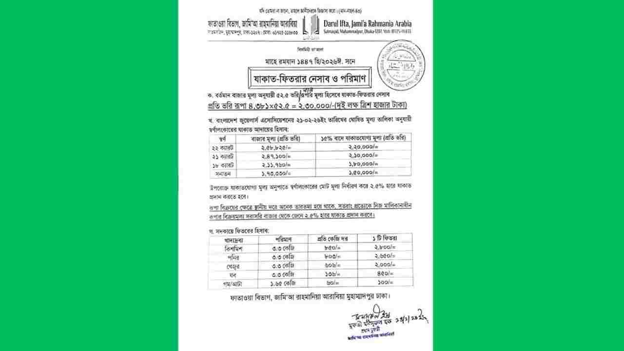 রাহমানিয়া আরাবিয়ার ঘোষণা: যাকাত-ফিতরার নেসাব ২,৩০,০০০ টাকা