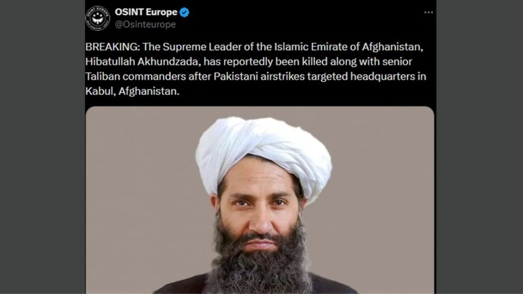 পাকিস্তানের সেনাবাহিনীর ‘অপারেশন গজব-লিল হক’ অভিযানে আফগানিস্তানের সর্বোচ্চ ধর্মীয় নেতা হিবাতুল্লাহ আখুন্দজাদা নিহত হয়েছেন বলে দাবি করেছে আন্তর্জাতিক গোয়েন্দা থিঙ্কট্যাংক সংস্থা ওপেন সোর্স ইন্টেলিজেন্স (ওসিন্ট)-এর ইউরোপ শাখা।