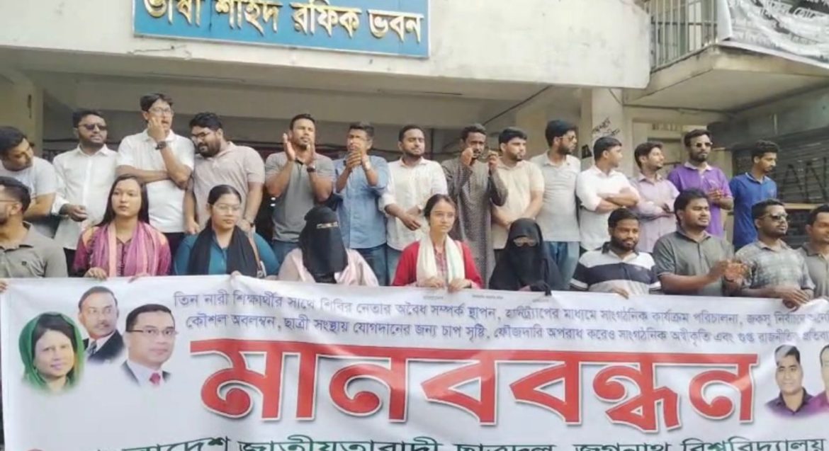 জবি প্রতিনিধি: জগন্নাথ বিশ্ববিদ্যালয়ে (জবি) ছাত্রশিবিরের ‘গুপ্ত রাজনীতি’, হানি ট্র্যাপের মাধ্যমে নারী শিক্ষার্থীদের সঙ্গে প্রতারণা ও যৌন হয়রানির অভিযোগের বিচার দাবিতে বিক্ষোভ ও মানববন্ধন করেছে শাখা ছাত্রদল। মঙ্গলবার (২১ এপ্রিল) বিশ্ববিদ্যালয়ের ভাষা শহীদ রফিক ভবনের সামনে আয়োজিত এই মানববন্ধনে সংগঠনটির নেতাকর্মীরা অভিযুক্তদের দৃষ্টান্তমূলক শাস্তির দাবি জানান। বক্তারা অভিযোগ করেন, শিবির তাদের কর্মীদের পরিচয় গোপন রেখে ক্যাম্পাসে পরিকল্পিতভাবে সাংগঠনিক ও অপতৎপরতা চালিয়ে যাচ্ছে।