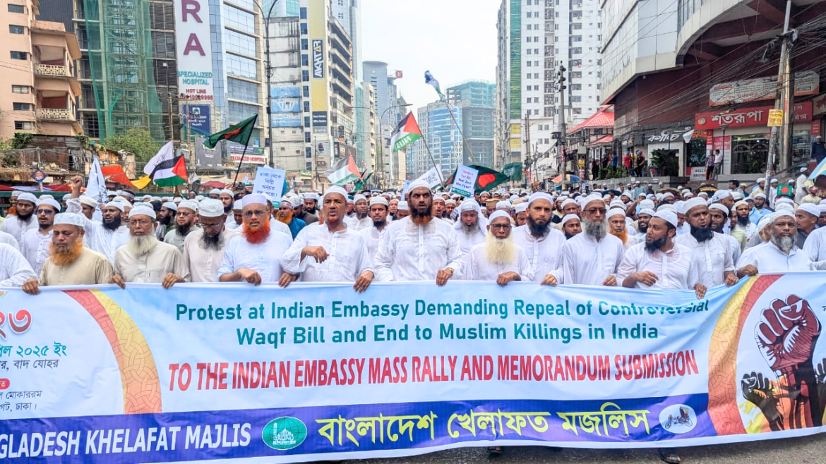 ভারতের সংসদে পাশকৃত বিতর্কিত ওয়াক্ফ সংশোধনী বিল বাতিল ও মুসলিম নিধন বন্ধের দাবীতে আজ ২৩ এপ্রিল বাংলাদেশ খেলাফত মজলিসের উদ্যোগে গণমিছিল ও স্মারকলিপি প্রদান কর্মসূচি অনুষ্ঠিত হয়েছে।