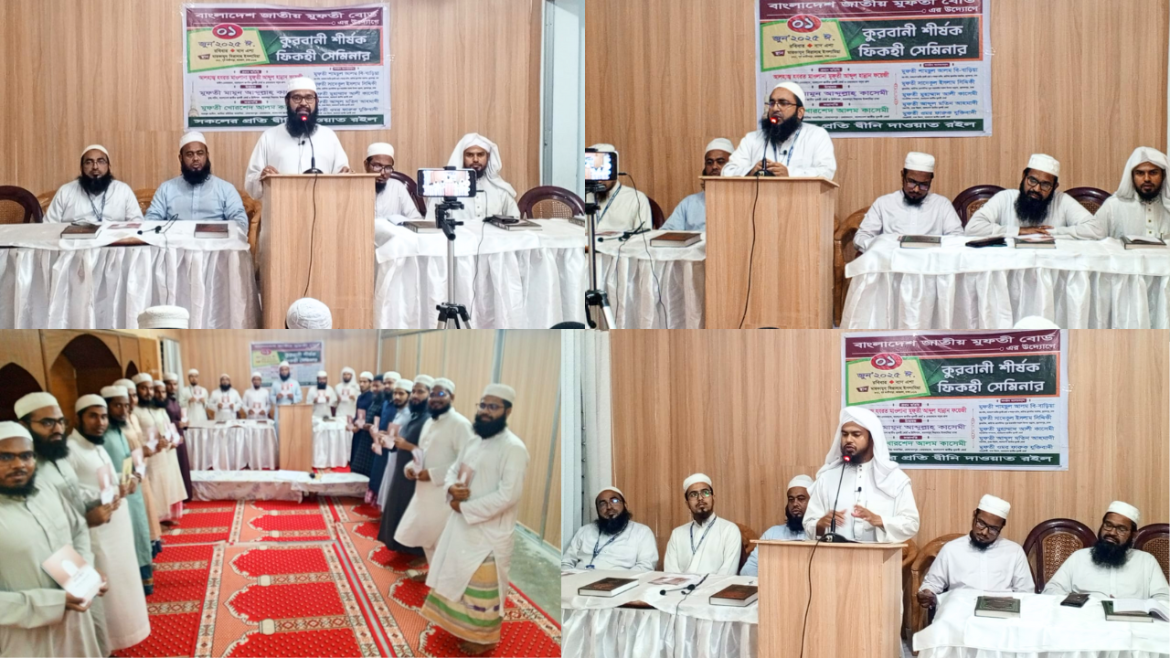 আসন্ন পবিত্র ঈদুল আজহা উপলক্ষে “কুরবানী শীর্ষক ফিকহী সেমিনার” অনুষ্ঠিত হয়েছে। রবিবার (১ জুন) রাজধানীর কাফরুল, পূর্ব কাজীপাড়াস্থ ৮৮১ নম্বর ঠিকানায় অবস্থিত মারকাযুদ্ দিরাসাহ ইসলামিয়া প্রাঙ্গণে এ সেমিনার আয়োজন করে বাংলাদেশ জাতীয় মুফতী বোর্ড।